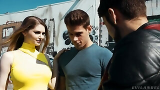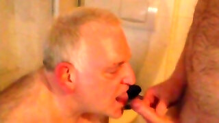 Slim brunette caught a young boy fellating his stepdad's cock and then she joined them for a great bisexual threesome