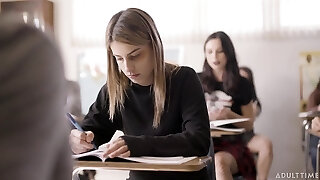 Yummy school chick Adria Rae gives her head and gets fucked on the tutors table