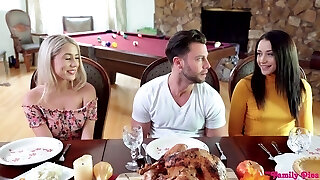 Small titted, blonde honey is getting boinked during a family lunch and gobbling pussy along the way