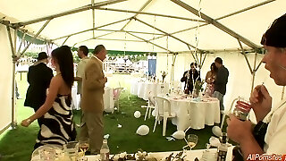 A tattooed slut swallows a guy's ample dick in front of everyone.